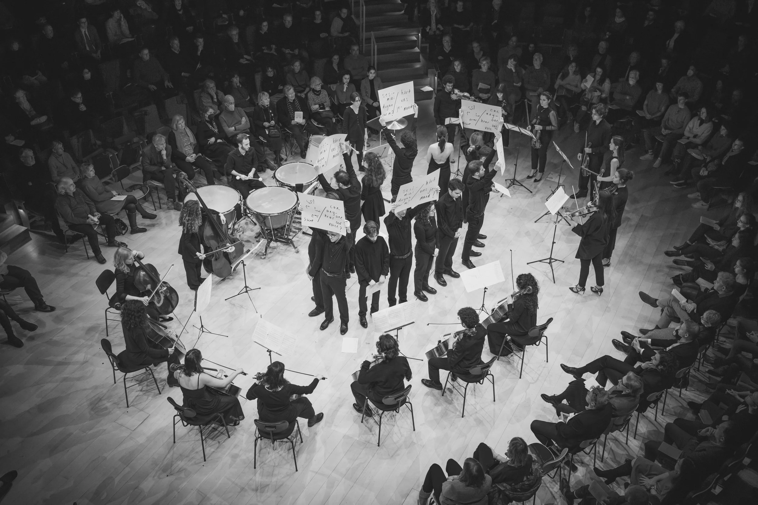 The piece opens with strings unfolding long, resonant chords. A voice - that of student Begüm Aslan - enters, fragile yet steadfast, articulating the first lines of the composition, while electronics weave a shadowed texture, amplifying the darkness. Timpani echo, calling the choir forward: “They say soul, soul / Now I understand what is the soul.” The words dissolve into humming, merging with the tremolo of strings and timpani, creating a soundscape of collective grief.